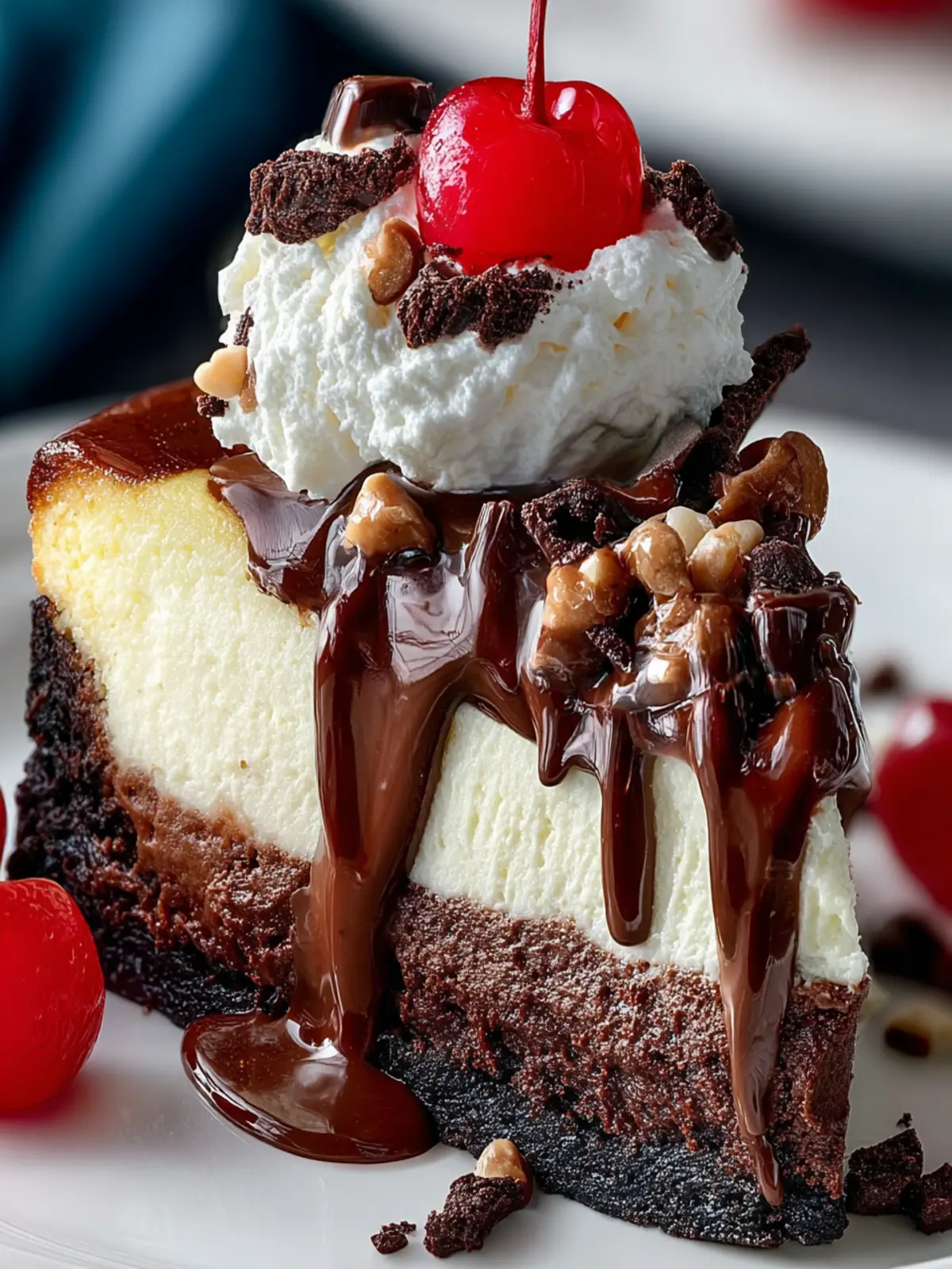 15. Just before serving, top cheesecake with whipped cream, drizzle fudge, sprinkle nuts and brownie bits, and place a cherry on top.