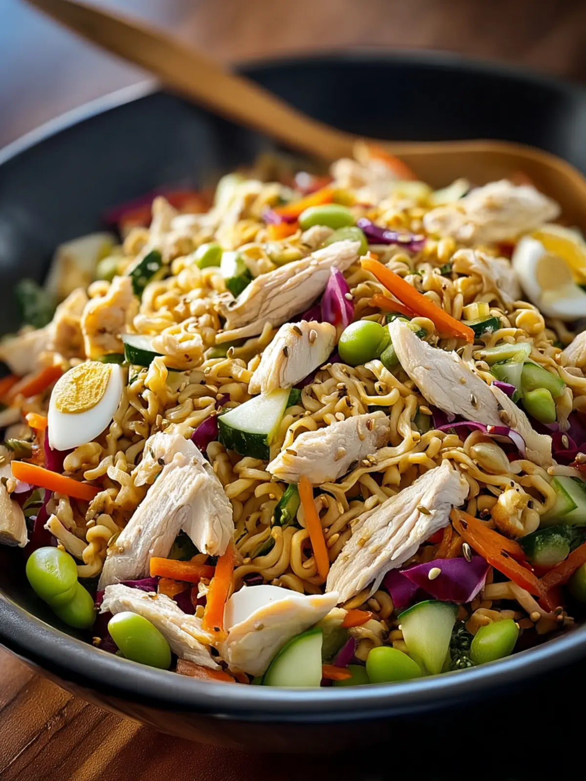 A refreshing chicken ramen salad with colorful vegetables and a savory dressing.