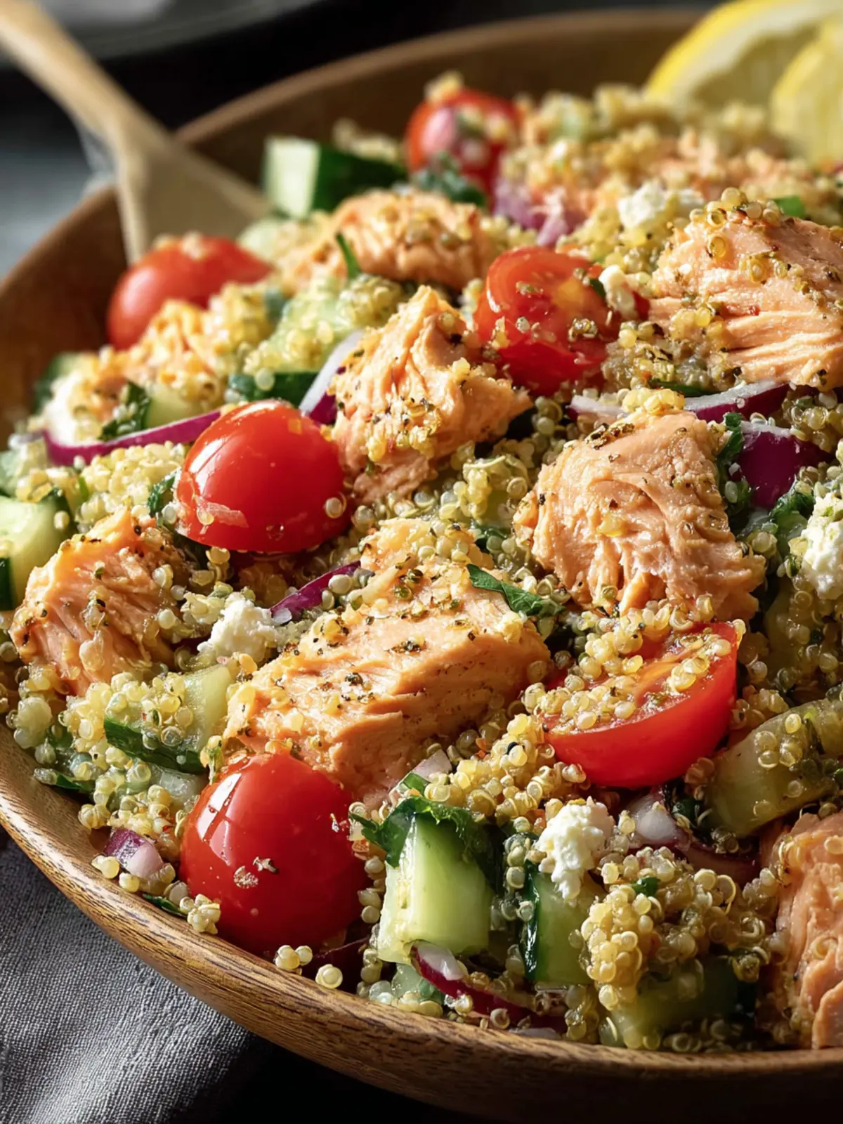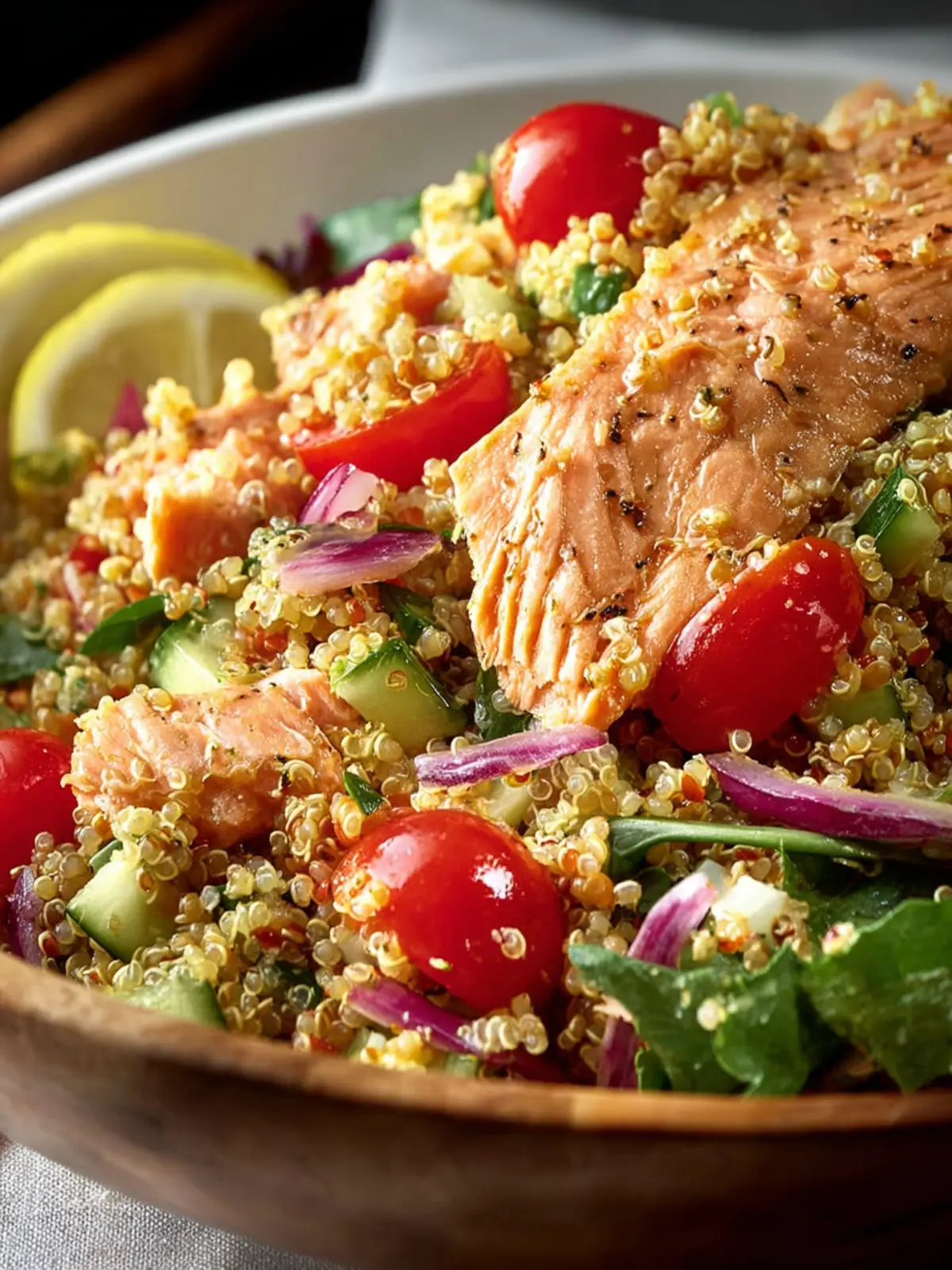 A refreshing quinoa salad with baked salmon, cherry tomatoes, cucumber, and a lemon vinaigrette.